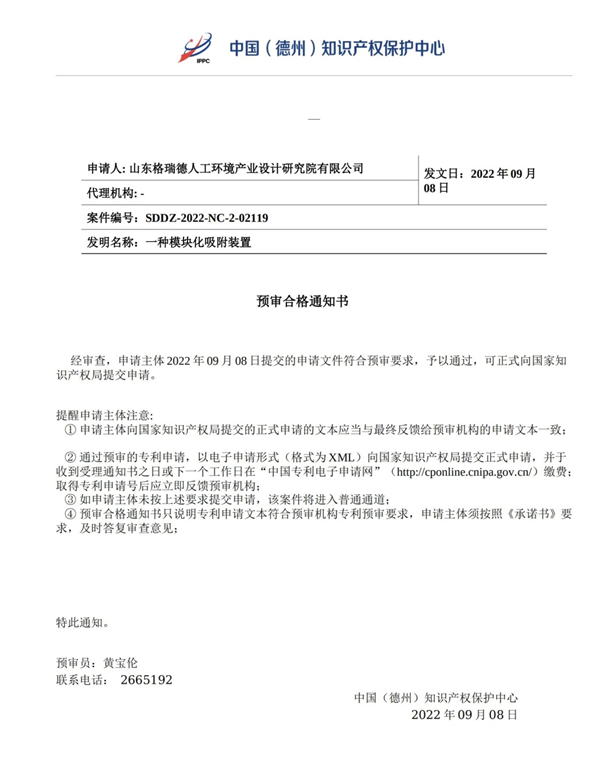 该专利是中国(德州)知识产权保护中心开展快速预审服务以来集团首件获得国家授权的专利,标志着集团在自主创新之路上实现了“格瑞德速度”。预审合格后,8月31日该专利申请被正式提交至国家知识产权局,9月8日即获得授权。与一般实用新型专利常规审查程序所需的8个月左右相比,授权周期大幅缩减。格瑞德人工环境产业设计研究院近日提交的“一种模块化吸附装置”专利文件,也已顺利通过保护中心预审,进入国家专利局快速审查通道。本月还将有两项发明专利通过保护中心快速预审平台提交,为集团知识产权快速确权提供新引擎。