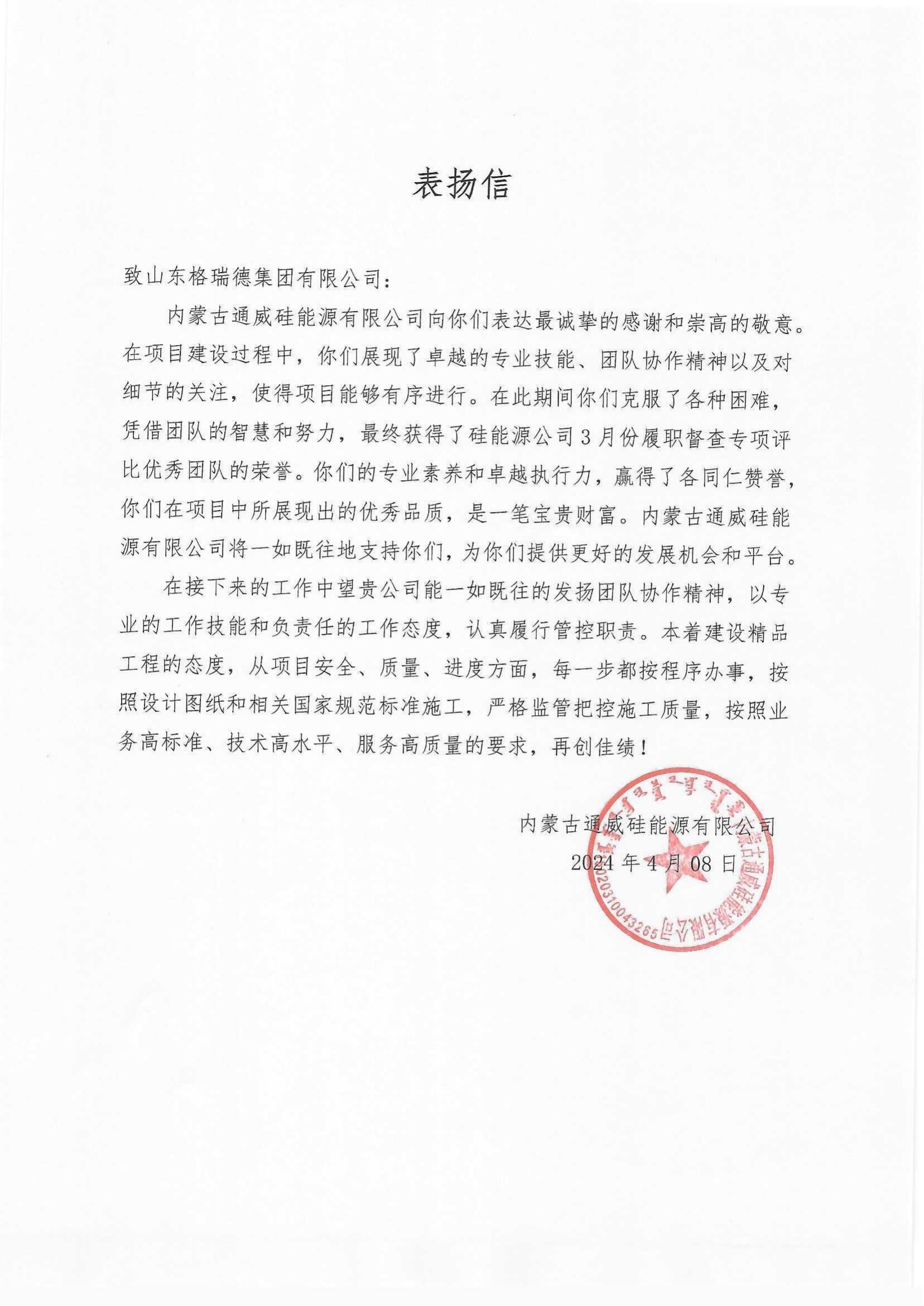 格瑞德在内蒙古通威项目中表现卓越,赢得了甲方的高度认可与赞誉