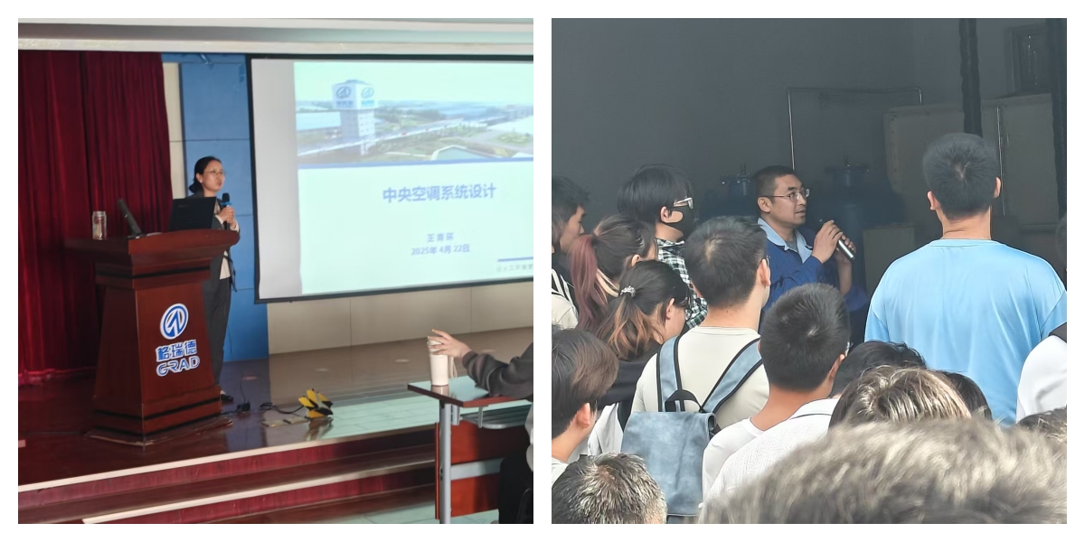格瑞德环境科技公司系统工程组的王青环、刘立志则聚焦中央空调系统,为学生们进行了系统讲解及图纸设计演示。技术总工刘立志更是亲自带领学生们走进中央空调机房,让大家近距离观察设备的运行情况,进一步加深对专业知识的理解。