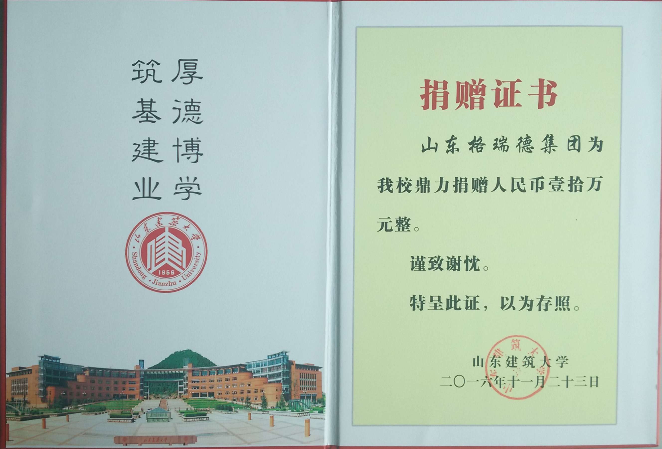 11月25日,山东格瑞德集团捐赠仪式暨校企合作座谈会在山东建筑大学召开,集团董事长管印贵、行政总监马利忠以及业务接待部长尹兴华参会,山建副校长范存礼参会。