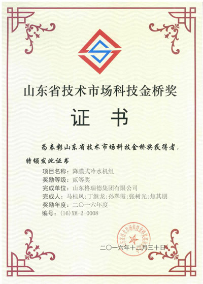 为认真贯彻落实省委省政府决策部署,全面深化科技体制改革、深入实施创新驱动发展战略,充分发挥科技金桥奖桥梁纽带作用,表彰在全省技术市场工作中做出突出贡献的集体、个人和优秀科技成果转化项目,近日,依据《山东省技术市场科技金桥奖奖励办法》并经专业组评审、评审委员会评审、奖励委员会评审,山东省技术市场科技金桥奖奖励委员会发布了《关于2016年度山东省技术市场科技金桥奖奖励的决定》,山东格瑞德集团有限公司获得山东省技术市场科技金桥奖先进集体奖;集团降膜式冷水机组荣获山东省技术市场科技金桥奖优秀项目二等奖。