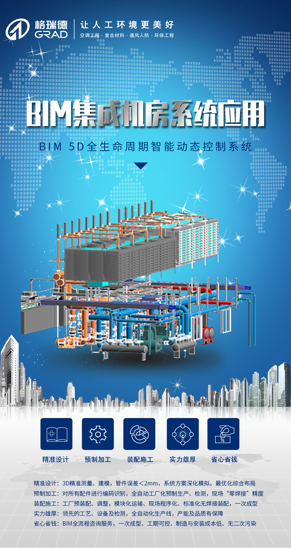 格瑞德致力于让人工环境更美好,通过打造空调工程、通风人防、复合材料、环保工程领域的全过程解决方案来满足客户需求,格瑞德构建了包括品牌规划、系统设计、技术开发、产品制造、整体施工、维护服务、检测认证、人才交流、产业集群的全生命周期产业链和产业生态。