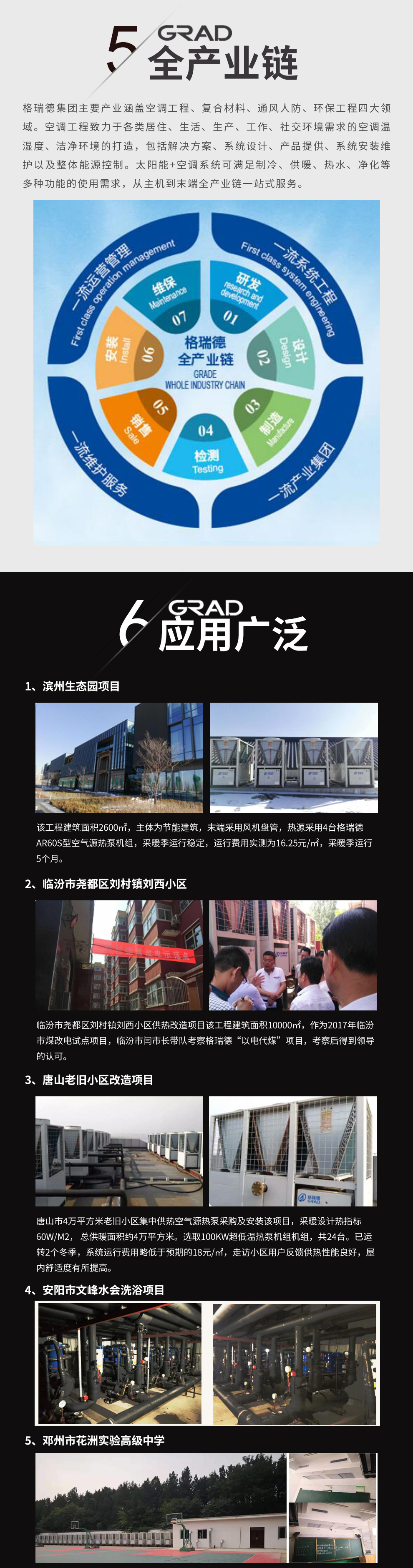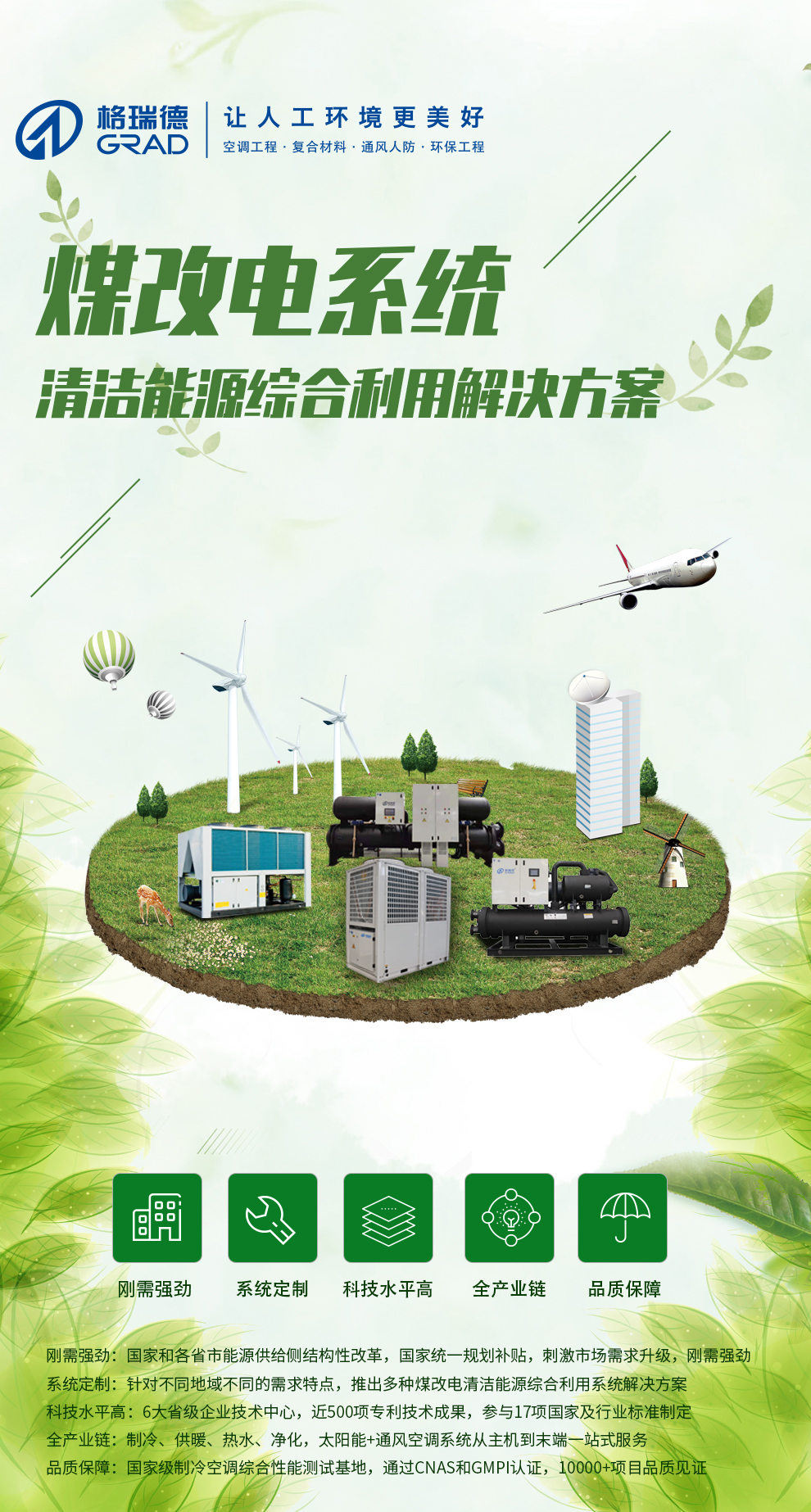 格瑞德致力于让人工环境更美好,通过打造空调工程、通风人防、复合材料、环保工程领域的全过程解决方案来满足客户需求,格瑞德构建了包括品牌规划、系统设计、技术开发、产品制造、整体施工、维护服务、检测认证、人才交流、产业集群的全生命周期产业链和产业生态。